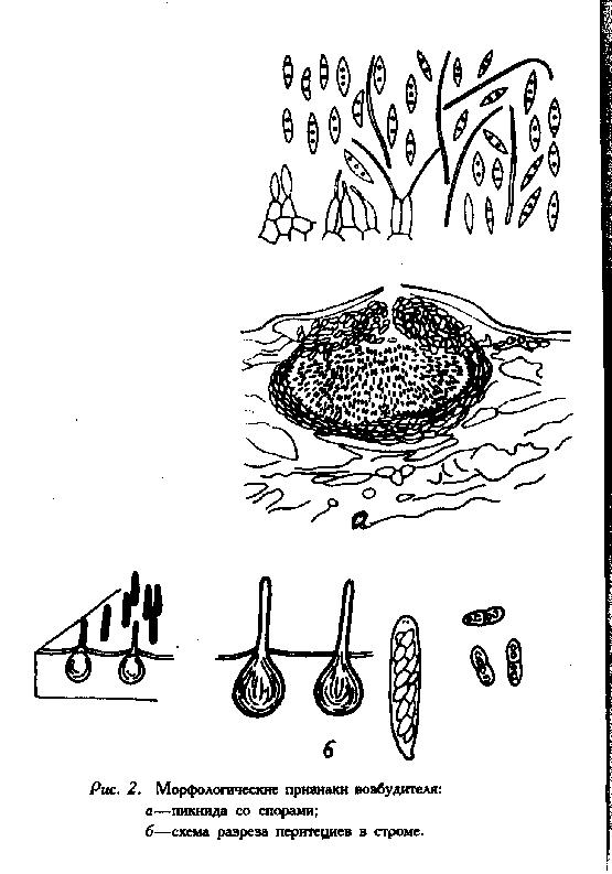 Морфология и биология возбудителя: Размножение гриба происходит пикноспорами, которые образуются в огромных количествах в пикнидах, погруженных в строму. Пикниды шаровидной или чечевицеобразной формы, черные, 112-542Х98-385 мкм в диаметре, однокамерные иногда многокамерные, причем каждая камера имеет отверстие на вершине, с коротким до 200 мкм в длину или отсутствующим носиком. Конидиеносцы короткие, тонкие, простые, бесцветные,