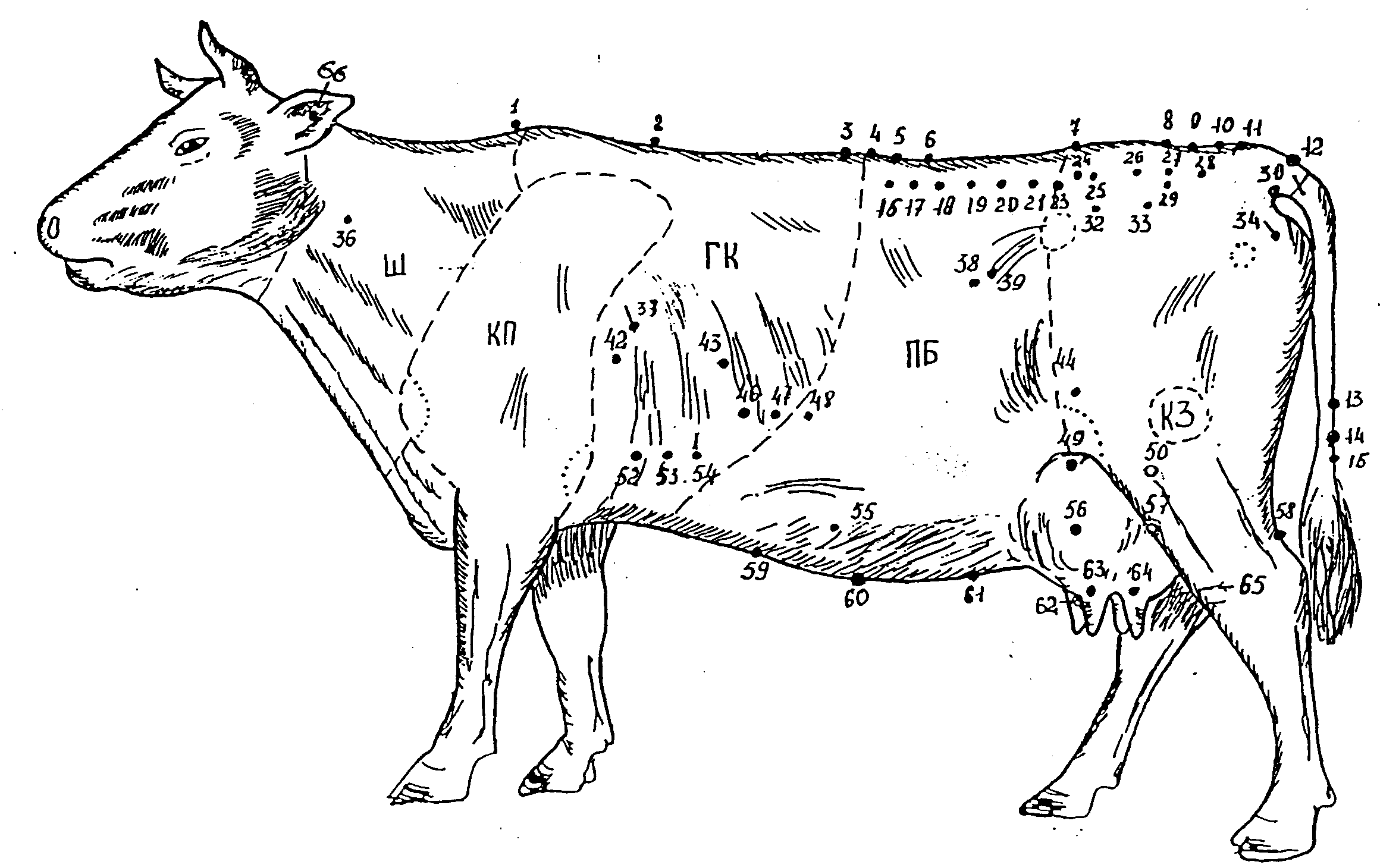 Рис.2 Остеолокализация биологических активных точек у коров "вид сбоку"